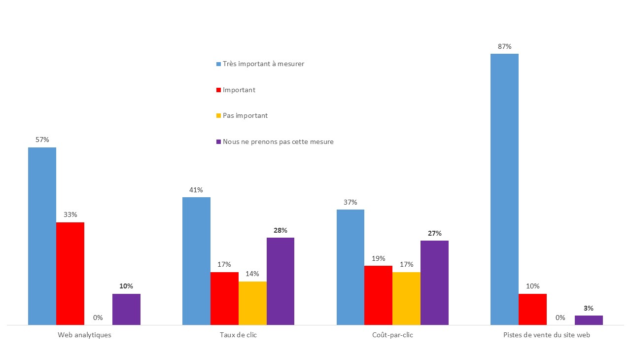 Selon l’étude « Connecting Your Digital Dots », 87% des concessionnaires classaient les pistes de vente mesurables à partir des formulaires de leur site web et des appels téléphoniques comme étant « très importantes », bien que cela aurait dû être 100%. Dix pourcent classaient la mesure des pistes de vente comme étant « importante ». Le 3% restant ne mesuraient pas du tout leurs résultats de pistes de vente. Point intéressant, les concessionnaires étaient somme toute partagés au sujet du classement des données métriques moins axées sur le retour sur l’investissement. Le Web analytique, le taux de clic (TDC) et le coût-par-clic (CPC) plaçaient un nombre important de concessionnaires aux deux extrémités du spectre, de « important » et « très important » à « pas important » et « nous ne prenons pas cette mesure ».